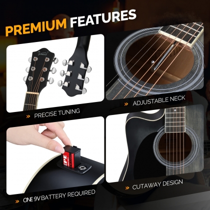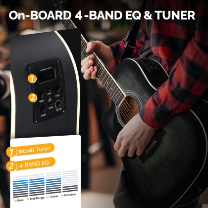 3. 【CONSIDERATE FEATURES】In addition to the on-board 4-band EQ with low-battery-display which can freely adjust bass, mid-range, treble and presence, the beginners left-handed guitar also has an inbuilt tuner. Just install 1 9V battery (not included) on the bottom of the guitar and it's ready to use. The 18:1 gear and chrome tuning pegs make tuning efficient.