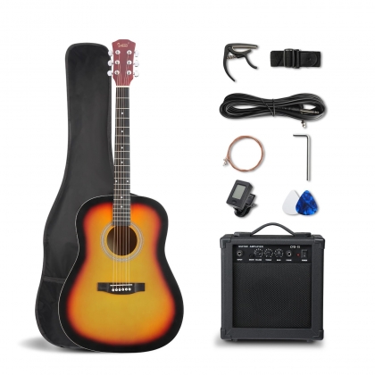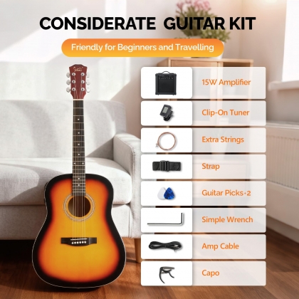 2.【COMPLETE ACCESSORIES KIT】: The all-in-one acoustic electric guitar kit includes an 15W amplifier, clip-on tuner, guitar bag, strap, picks, cable, spare strings and a wrench. It is convenient for beginners who can use it right out of the box. Note: The guitar and clip-on tuner don't include batteries.