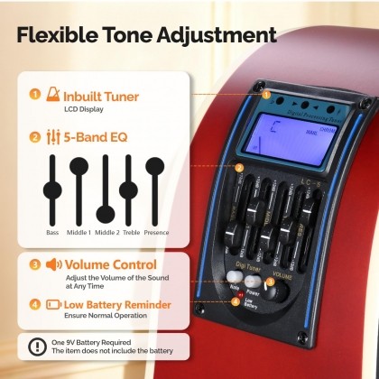 3.【CONSIDERATE FEATURES】: In addition to the on-board 5-band EQ with low-battery-display which can freely adjust bass, mid-range, treble and presence, the beginners guitar also has an in-built tuner. Just need to install one 9V battery (not included) on the bottom of the guitar and it's ready to use. The clip-on tuner also can help you adjust the music, which only need a button battery (not included).