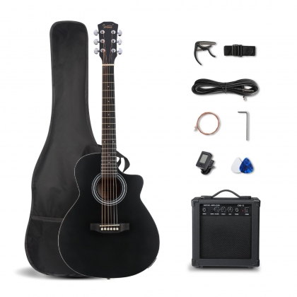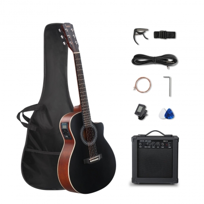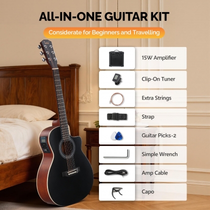 2.【COMPLETE ACCESSORIES KIT】: The all-in-one acoustic electric guitar kit includes an 15W amplifier, clip-on tuner, guitar bag, strap, picks, cable, spare strings and a wrench. It is convenient for beginners who can use it right out of the box. Note: The guitar and clip-on tuner don't include batteries.