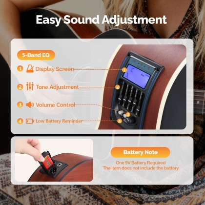 3.【CONSIDERATE FEATURES】: In addition to the on-board 5-band EQ with low-battery-display which can freely adjust bass, mid-range, treble and presence, the beginners guitar also has an in-built tuner. Just need to install one 9V battery (not included) on the bottom of the guitar and it's ready to use. The clip-on tuner also can help you adjust the music, which only need a button battery (not included).
