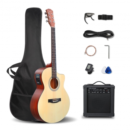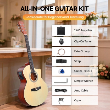 2.【COMPLETE ACCESSORIES KIT】: The all-in-one acoustic electric guitar kit includes an 15W amplifier, clip-on tuner, guitar bag, strap, picks, cable, spare strings and a wrench. It is convenient for beginners who can use it right out of the box. Note: The guitar and clip-on tuner don't include batteries.