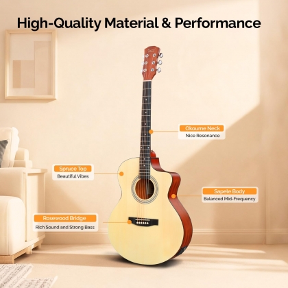 1.【UNIQUE DESIGH】: The 6 strings 41-inch acoustic electric guitar uses cutaway design, a cut at the junction of the body and neck makes the treble frets easier to reach when playing. The matte top design, combined with the smooth body and neck, exudes a soft sheen, making it even more elegant and dazzling under the light.