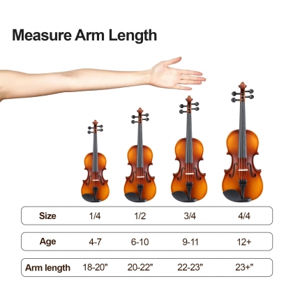 The following picture shows the length of each violin size. You can use your preferred method to find your length and determine the size of the violin you should get.