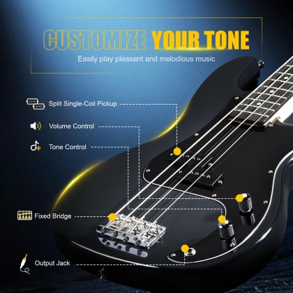 With its split single-coil pickup, 1 volume and 1 tone control knob, this PB-style bass guitar can play anything from blues to rock. Its thicker steel strings and larger string tension provide stable tune, producing better tone display than ordinary guitars.