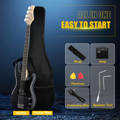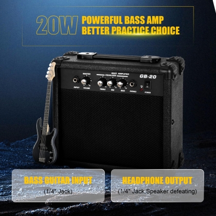 This beginner electric bass guitar set comes with all the accessories you need, including a 20-watt amp with built-in speaker, headphone output, and input jack. You can control the Volume, Treble, Mid, Bass, and Phones to discover your sound.